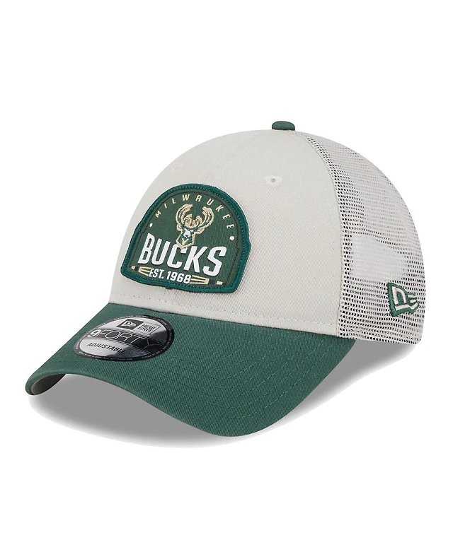 New Era Men's Khaki/Hunter Green Milwaukee Bucks Throwback Patch Trucker 9Forty Adjustable Hat