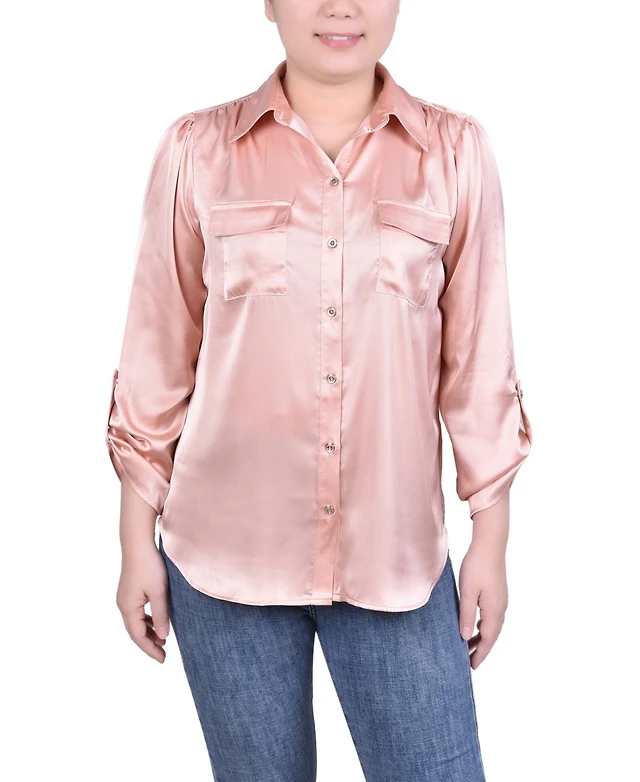 Ny Collection Petite Tabbed Long Sleeve Satin Blouse