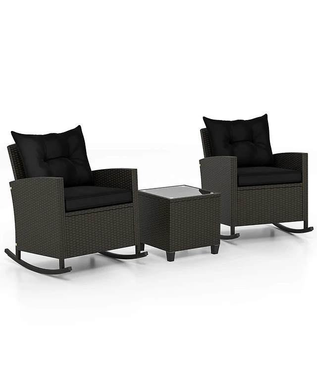 3 Pcs Patio Wicker Rocking Set with Tempered Glass Table & Soft Cushions Outdoor
