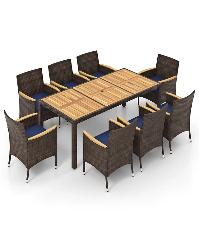 9 Pieces Outdoor Wicker Dining Set, Patio Dining Furniture Set with Acacia Wood Table and 8 Armchairs,Outdoor Table and Chairs Set with 2” Umbr