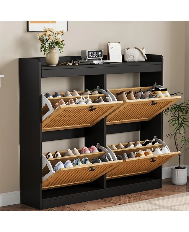 gaomon Modern Rattan Accent Storage Cabinet with 4 Doors & Shelf, Console Coffee Bar, Dining Room, Kitchen, Living Room, White