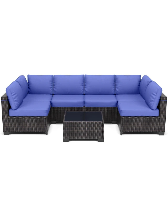 Slickblue 7 Pieces Hand-Woven Wicker Outdoor Furniture Set with Acacia Wood Coffee Table-White