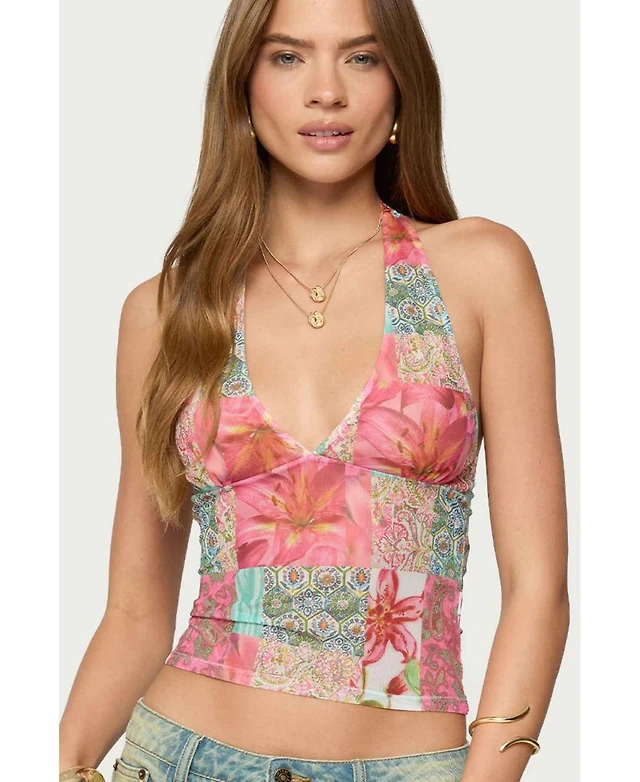 Edikted Womens Kasen Printed Mesh Backless Halter Top