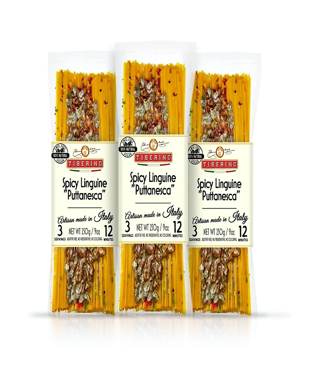 Tiberino One Pot Dish - Linguine Pasta Puttanesca with Tomato, Capers and Olives Sauce Sligthly Spicy - 8.8oz 250 Grams, Pack of 3