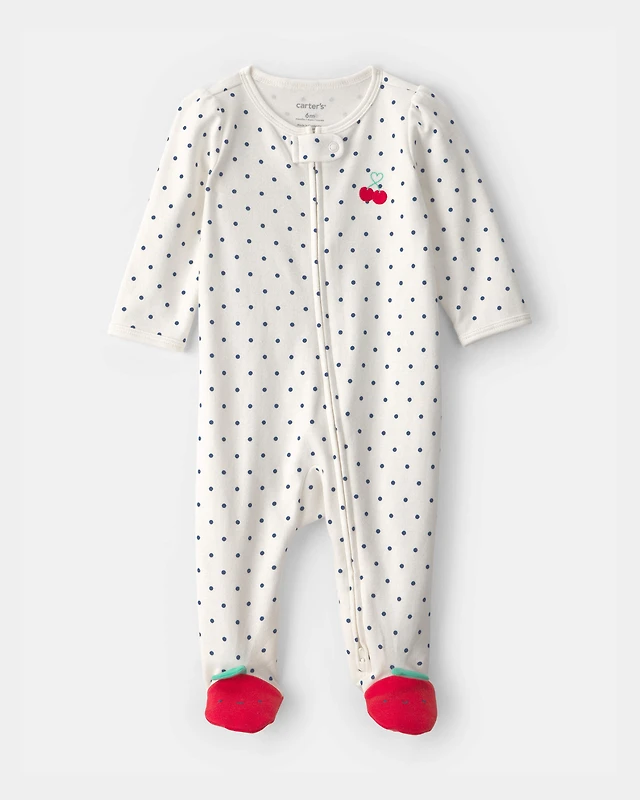 Baby Girl Cherry 2-Way Zip 100% Cotton Sleep & Play Pajama - White