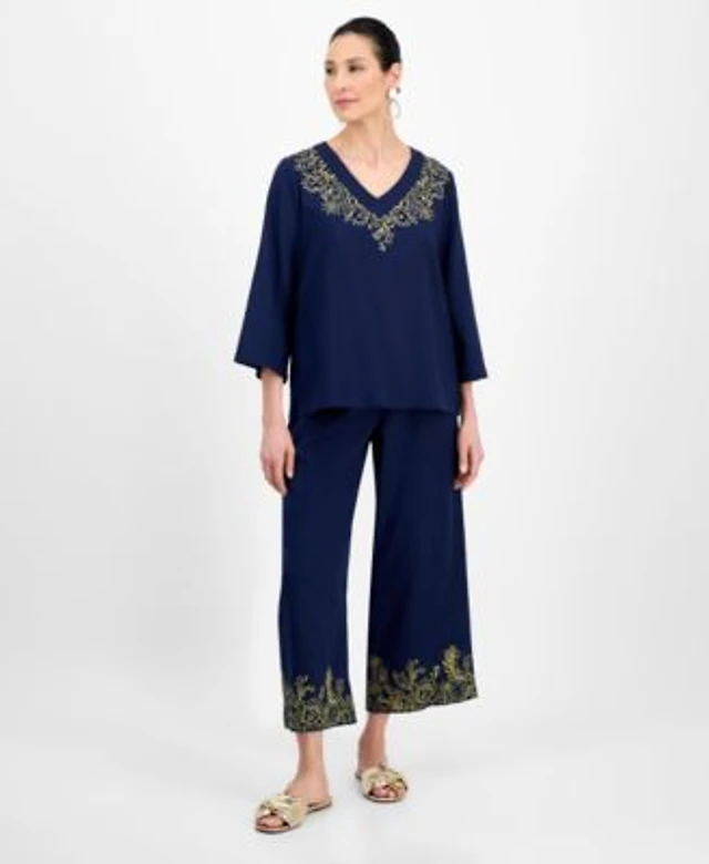 Kasper Womens Velvet Embellished Top Pull On Wide Leg Pants