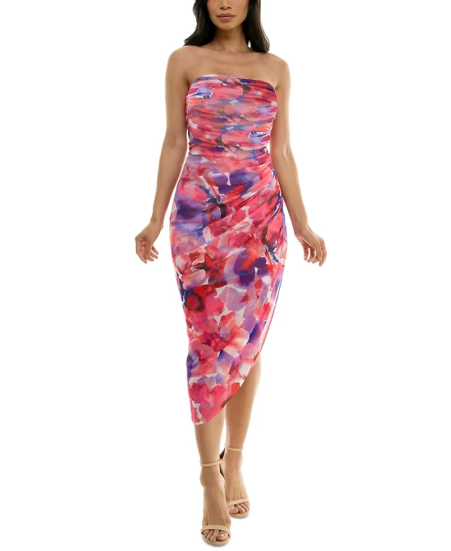 Emerald Sundae Juniors' Strapless Ruched Mesh Bodycon Midi Dress