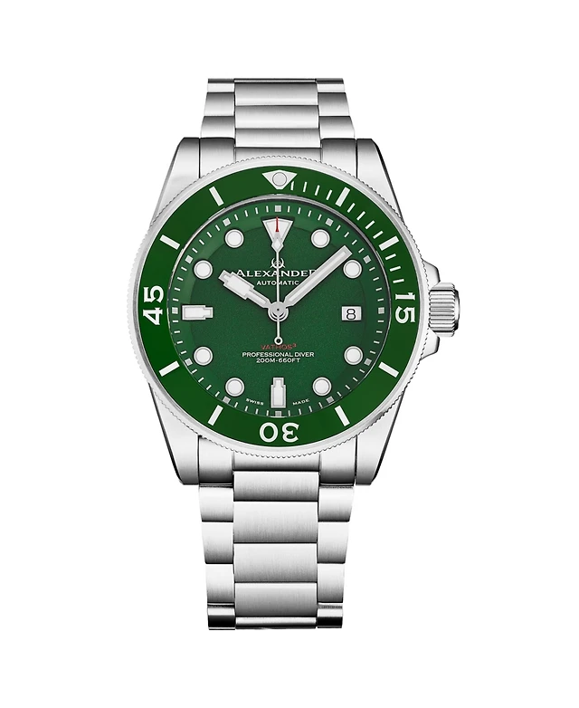 Alexander Vathos 3 Men s Swiss Made Watch Green Dial Green Bezel Luminous Hands and Markers Stainless Steel Case and Bracelet 42mm Case Date Window