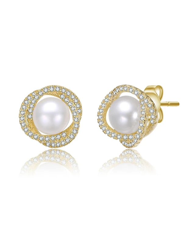 Sterling Silver 14k Gold Plated with Genuine Freshwater Round Pearl Stud Earrings