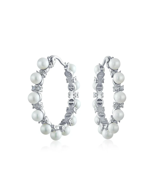 Cultured Freshwater Pearl (8mm) & Diamond Accent Dangle Hoop Drop Earrings in Sterling Silver