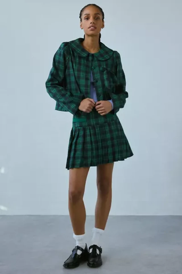 Miss Me Women's Medium Wash Denim Plaid Crochet Back Cropped Jacket