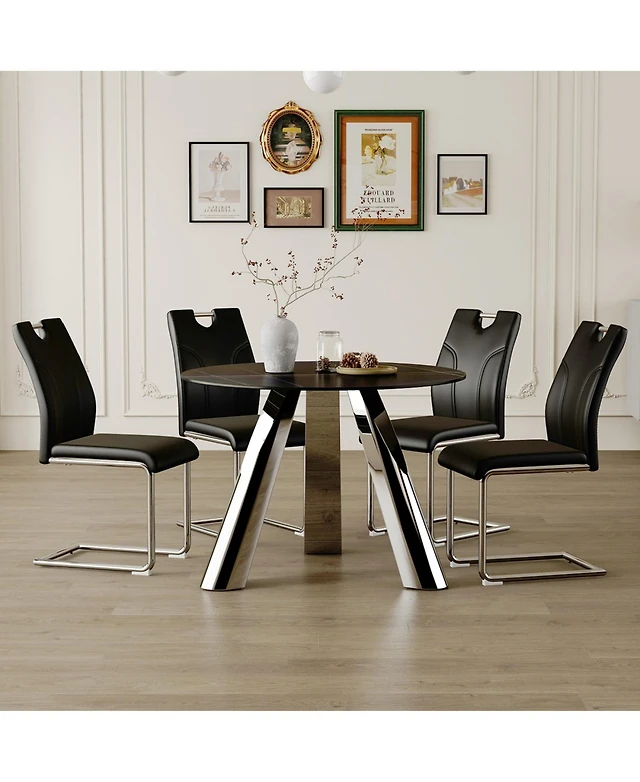 Streamdale Round Table and 4 Black Chairs with Silver Metal Legs, Sintered Stone Tabletop