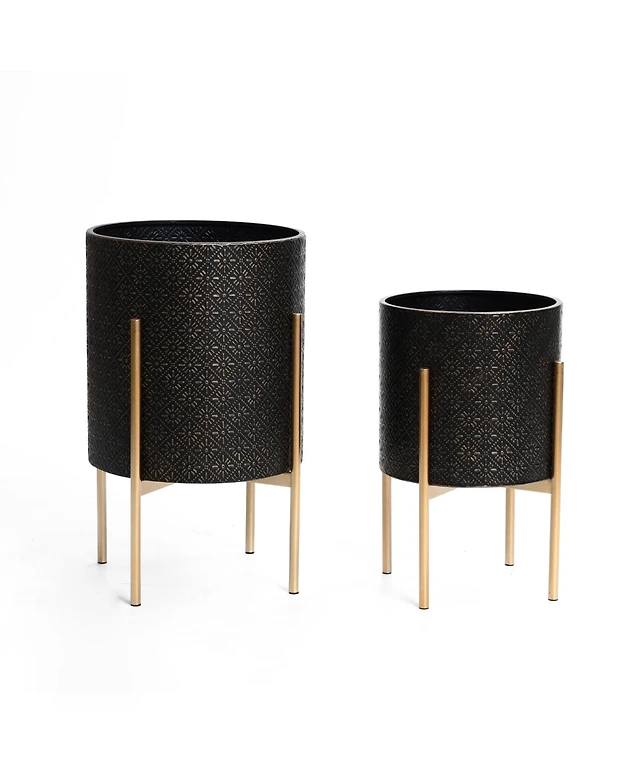 LuxenHome Set of 2 Black Floral Stamped Metal Cachepot Planters