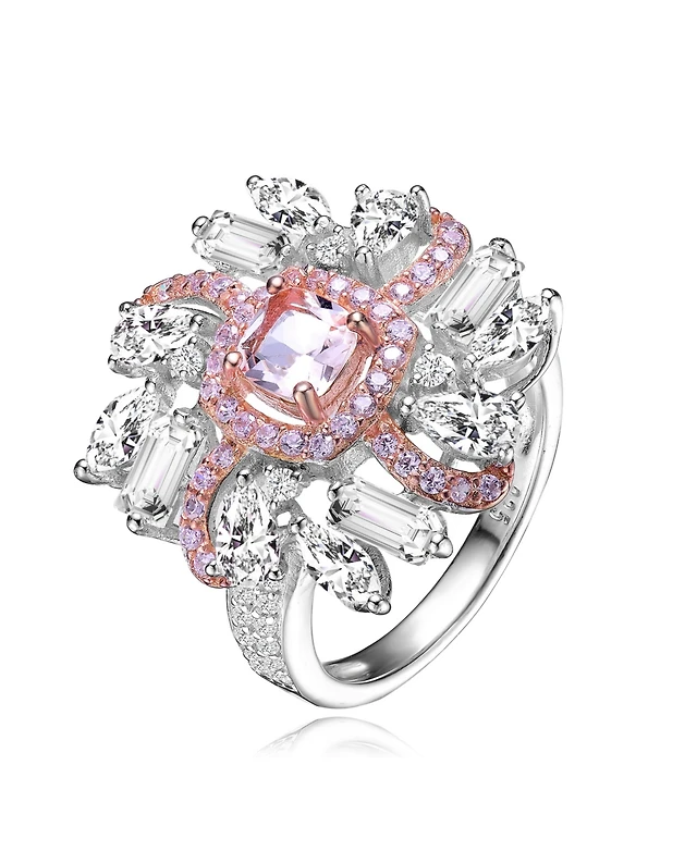 Sterling Silver White Gold and Rose Plated with Pink Clear Cubic Zirconia Cluster Ring
