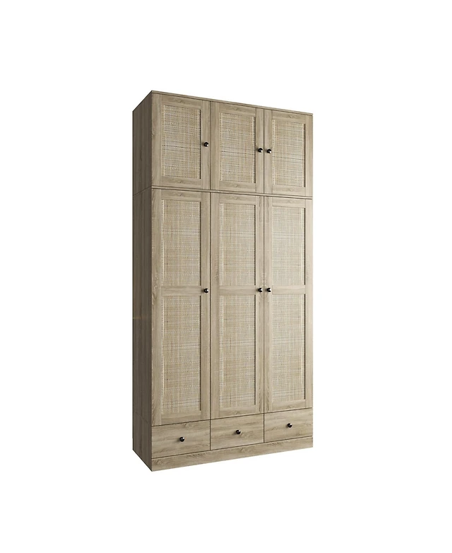 Homsee Rattan Doors Wardrobe with 3-Drawers, Hanging Rod,Bedroom Armoire,Closet