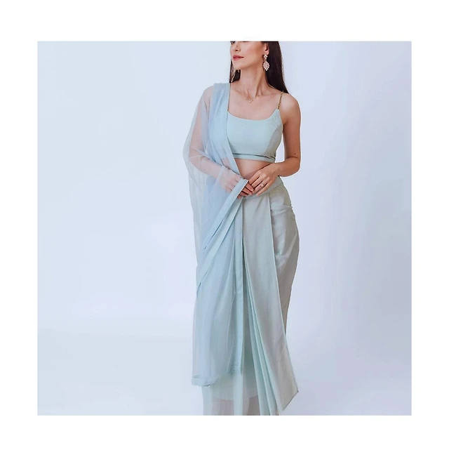 Raas Women's Sky Blue Shimmery Pleated Dhoti Skirt and Embellished Blouse Set