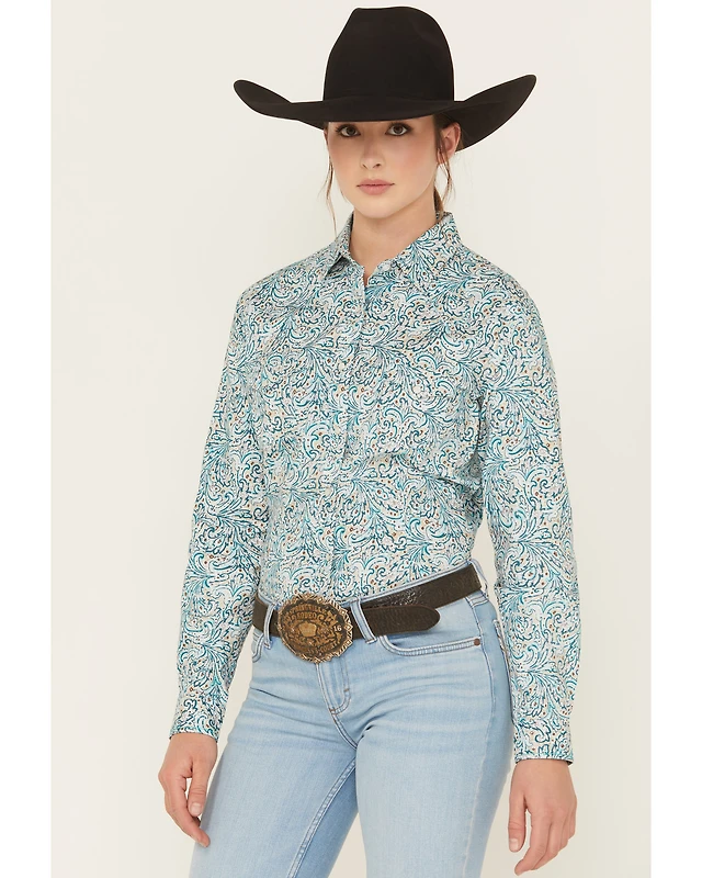 Rough Stock by Panhandle Women's Paisley Print Long Sleeve Pearl Snap Stretch Western Shirt