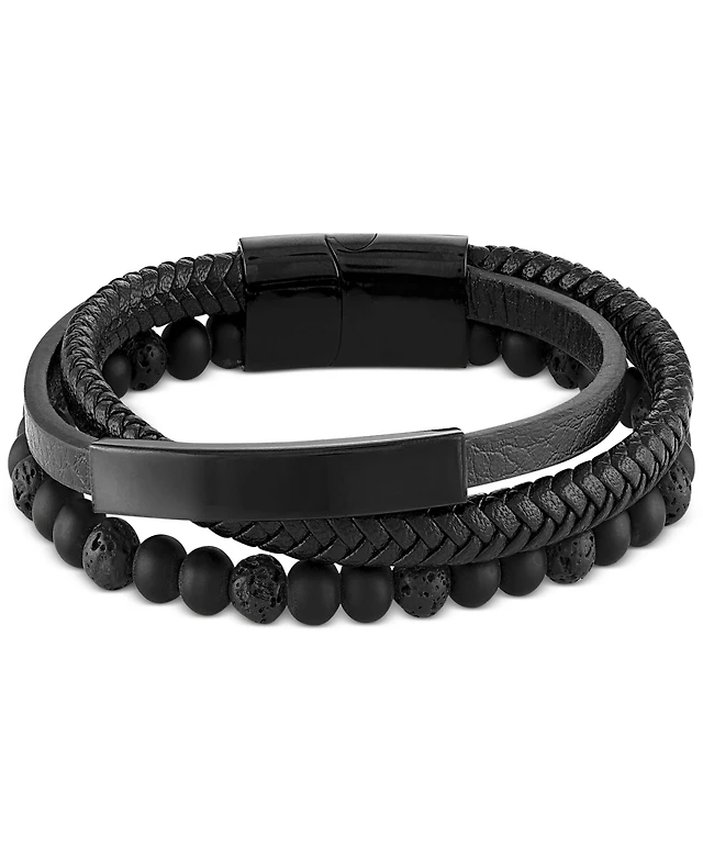 Men's Onyx & Lava Bead Triple Row Braided Leather Bracelet Black Ion-Plated Stainless Steel (Also Onyx/Sodalite)