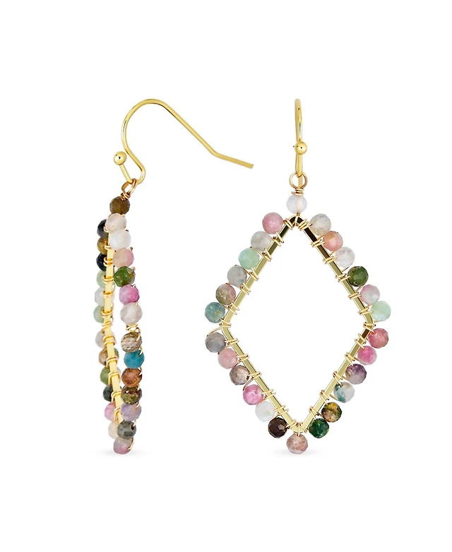 Bling Jewelry Geometric Wire Wrap Cluster Linear Fish Hook Multi Color Natural Fluorite Long Lightweight Rhombus Shape Dangle Earrings Gold Plated