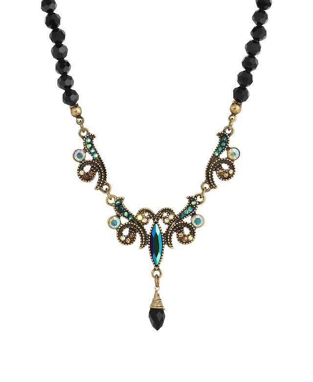2028 Gold-Tone Blue Iridescent Aurora Borealis Glass Stone and Jet Bead Necklace