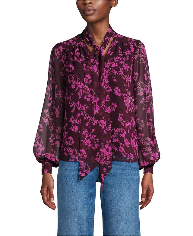 Jones New York Petite Printed Tie-Neck Puff-Sleeve Blouse
