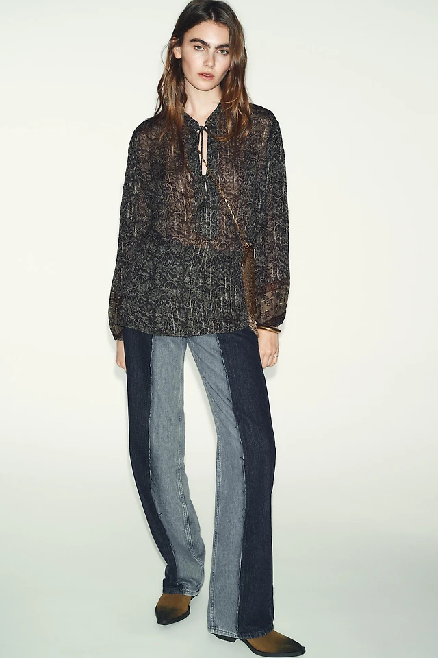 Jacquard Ruffle Sleeve Chiffon Blouse
