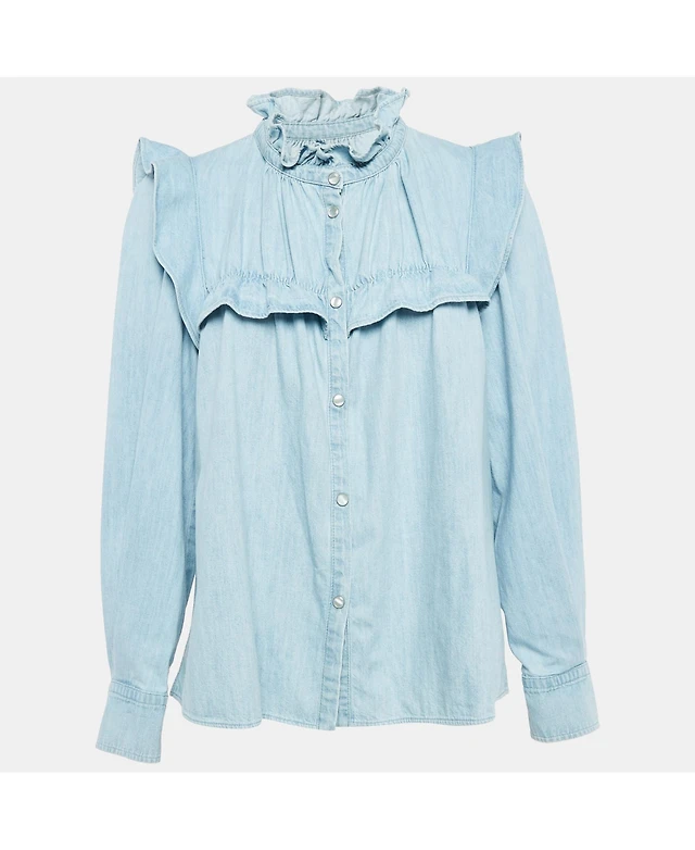 Buxom Couture Women's Plus Bow Neck Puff Sleeve Denim Blouse