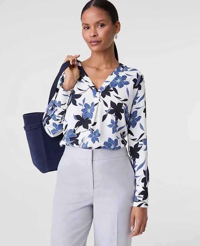 Ann Taylor Petite Floral Pleat Front Top Winter White Women's
