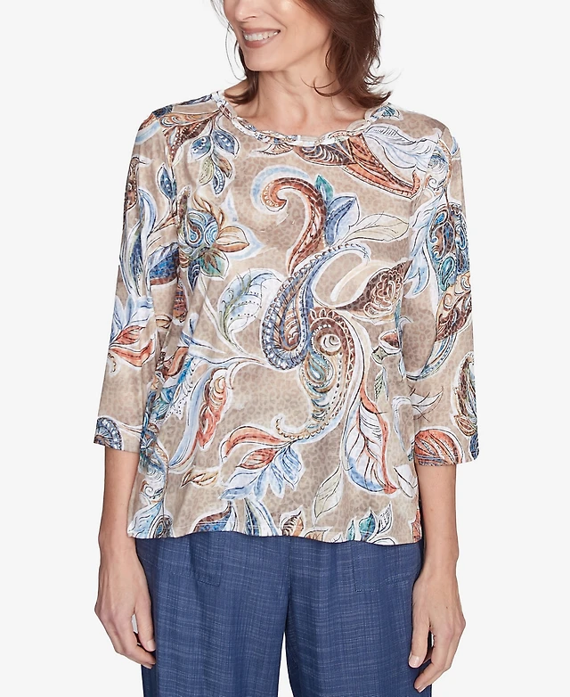Alfred Dunner Women's Lake Champlain Embroidered Scroll Ruched Sleeve Top