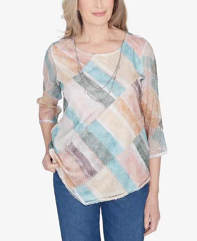 Alfred Dunner Women's Free Spirit Patchwork Sleeve Knit Top with Necklace