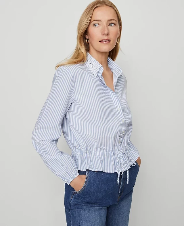 Ann Taylor Weekend Collection Striped Tie Waist Popover Top Cool Cascades Women's