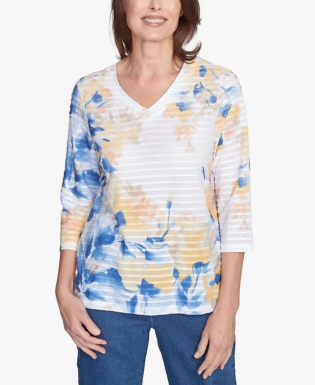 Alfred Dunner Women's Coming Up Roses Textured Watercolor Flower Top with Necklace
