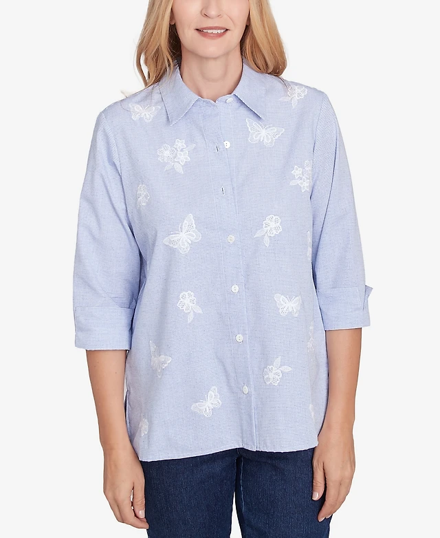 Alfred Dunner Women's Dress Code Linear Knit Floral Embroidered Crew Neck Top