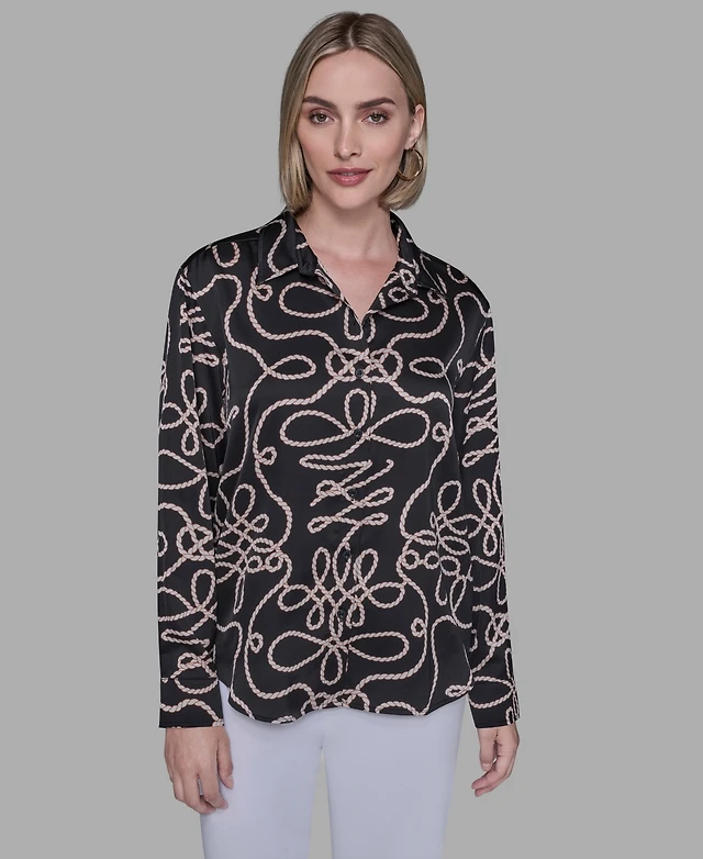 T Tahari Women's Printed Split-Neck Long-Sleeve Blouse