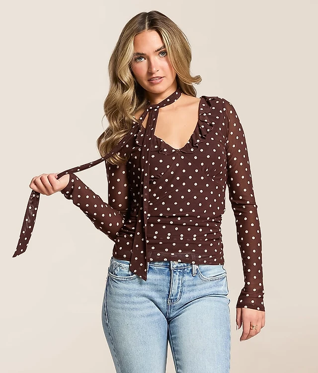 UO Fia Polka Dot Mesh Off-The-Shoulder Crop Top