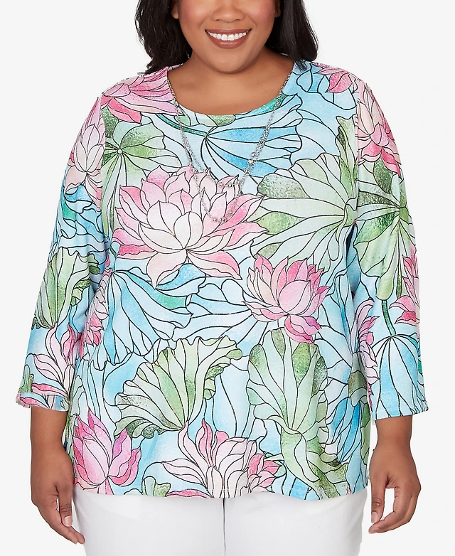 Alfred Dunner Plus Classic Floral Print Pointed Hem Top with Necklace