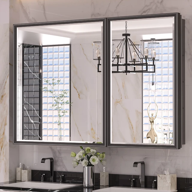 Casainc 35" 28 Inch Aluminum Mirror Cabinet with 3-Color Led and Defogging Feature - Khaki