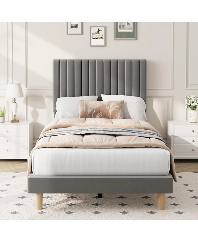 Twin Bed Frame for Kids with Velvet Upholstered Headboard, Cute Low Profile Platform Bed for Girls and Boys