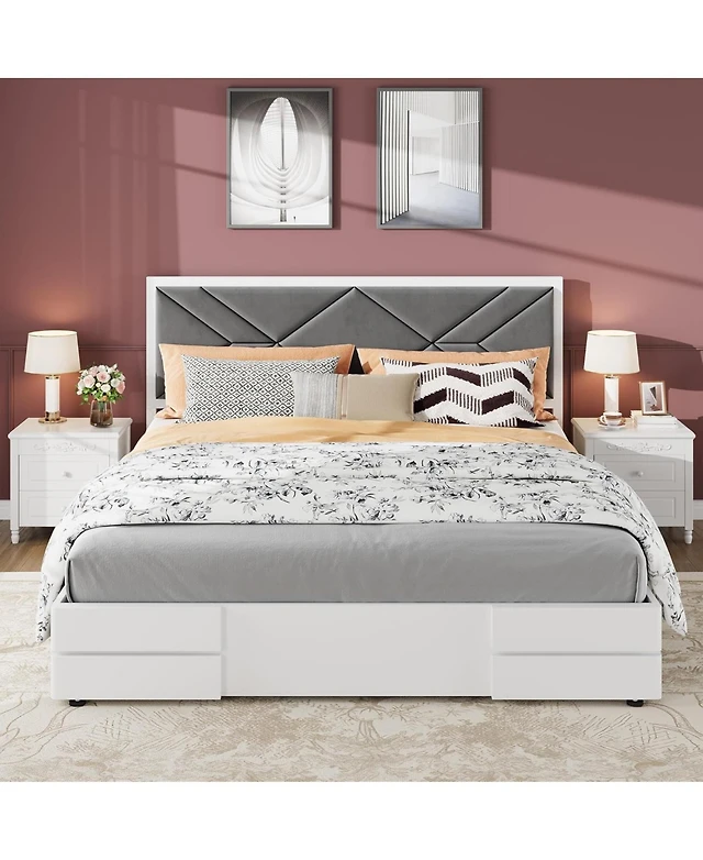 gaomon Queen Upholstered Platform Bed Frame with 4 Drawers, Nailhead Headboard, Charging Station, Led Lights, No Box Spring