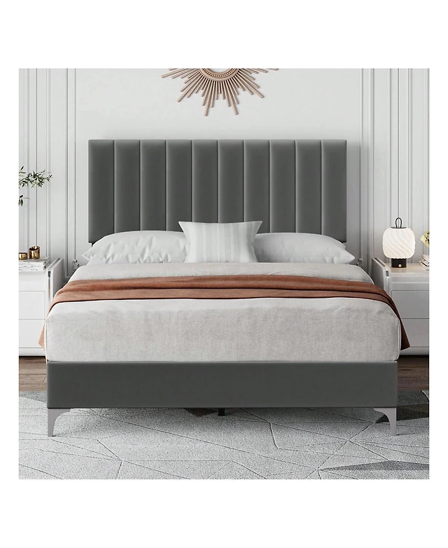 Gaomon Platform Bed Frame With Adjustable Velvet Headboard Vertical Channel Tufted Upholstered Design No Box Spring Needed