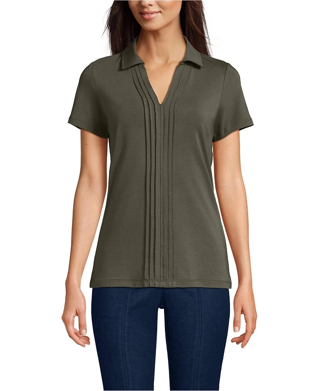 Lands' End Women's Plus Short Sleeve Lightweight Jersey Pintuck Open Collar Polo