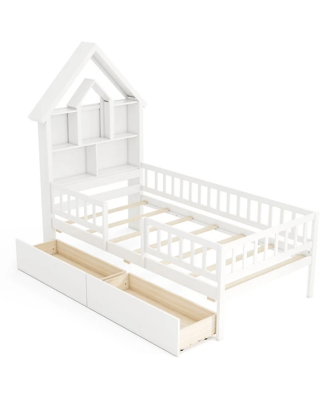 Simplie Fun Twin Size Wood Floor Bed With House-Shaped Headboard