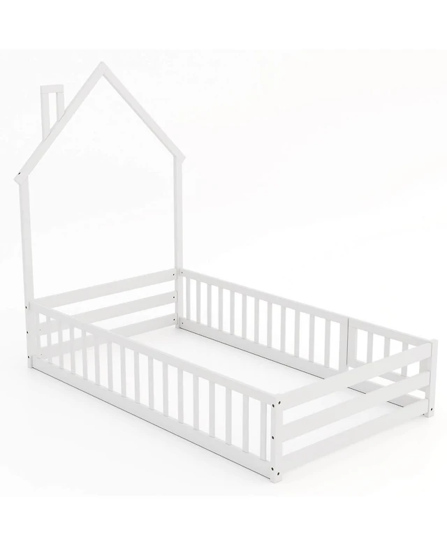 Streamdale Furniture Twin Size House Floor Bed with Guardrails, Roof, Tray & Signboard