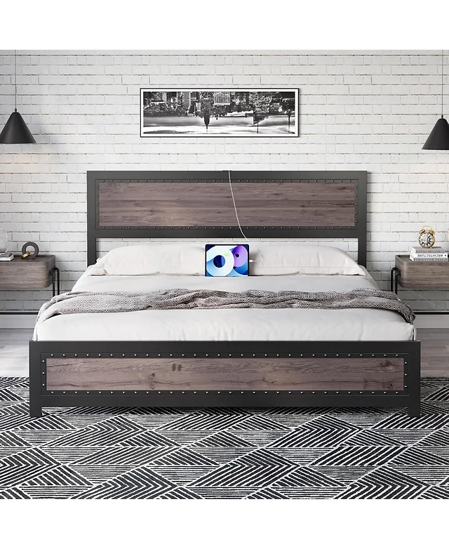 gaomon Full Size Bed Frame with Headboard, Industrial Platform Bed Frame with Charging Station