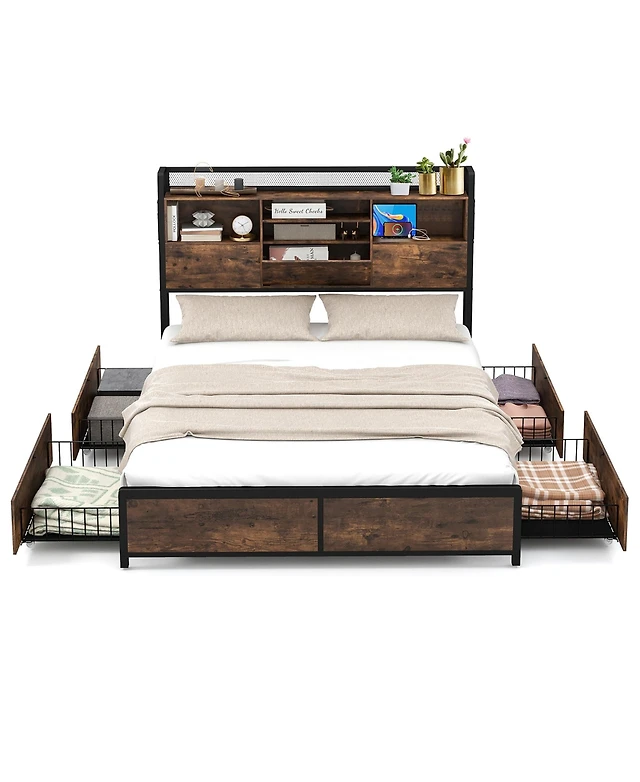 gaomon Bed Frame With Charging Station And 4 Storage Drawers, Velvet Upholstered Tall Tufted Wingback Headboard And Storage Shelf, No Box Spring Neede
