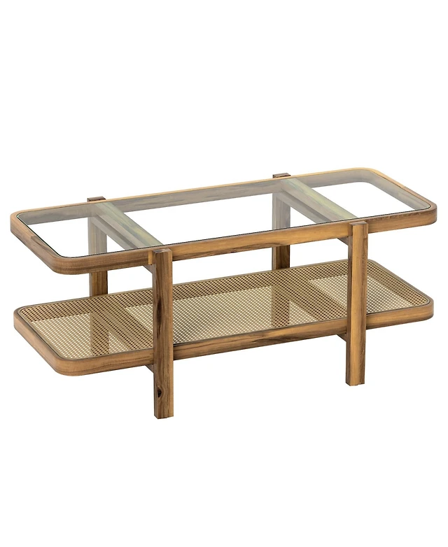 Gymax 2-Tier Glass Coffee Table w/ Storage Shelf Solid Rubber Wood Legs for Office