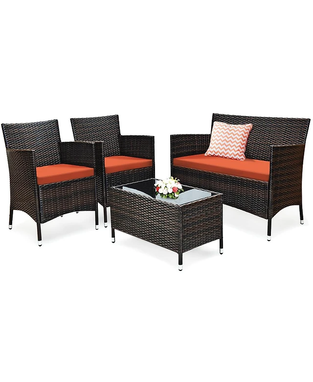 Gymax Set of 4 Rattan Furniture Set Cushioned Sofa Chair Coffee Table Patio