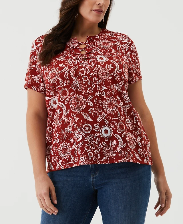 Ella Rafaella Plus Paisley Print Lace-Up Short Sleeve Tee Shirt