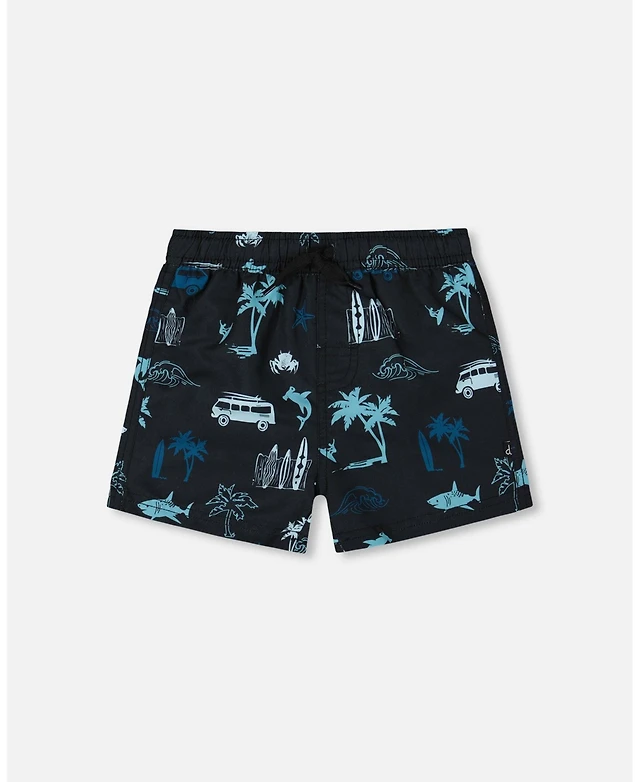 Deux par Deux Boys Printed Swim Trunks Light Blue Beach On Black