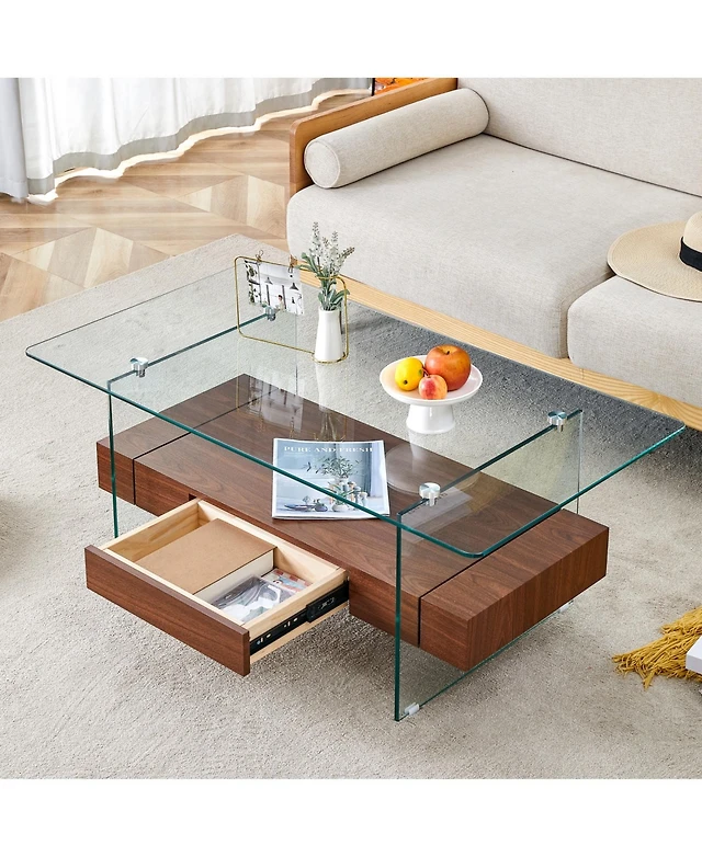 2-Tier Coffee Table Tempered Glass Top with Pe Rattan Shelf & Acacia Wood Frame